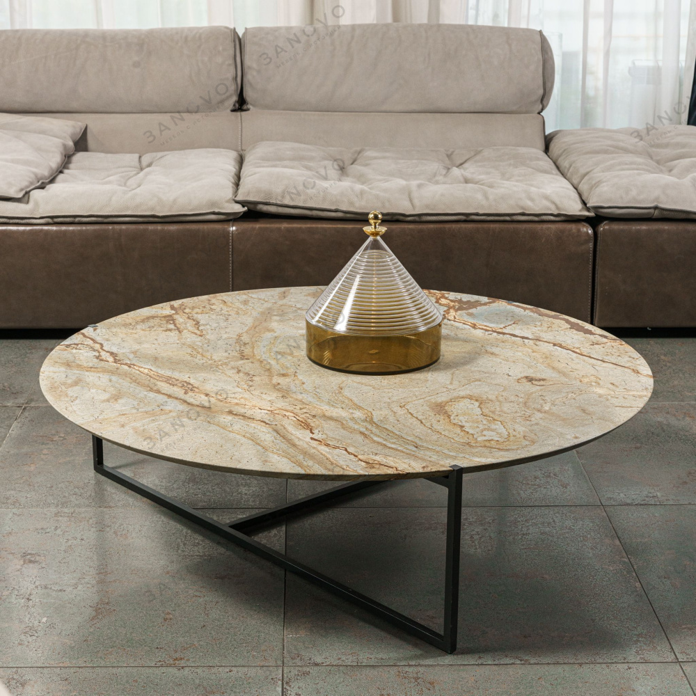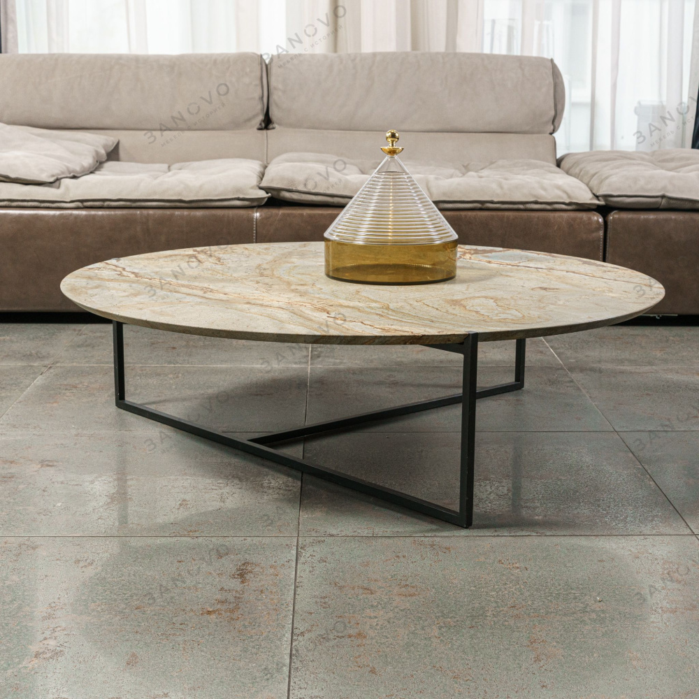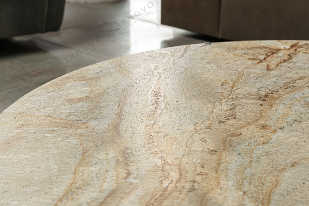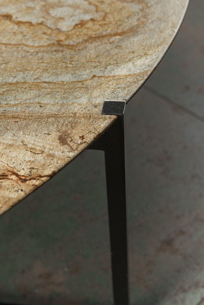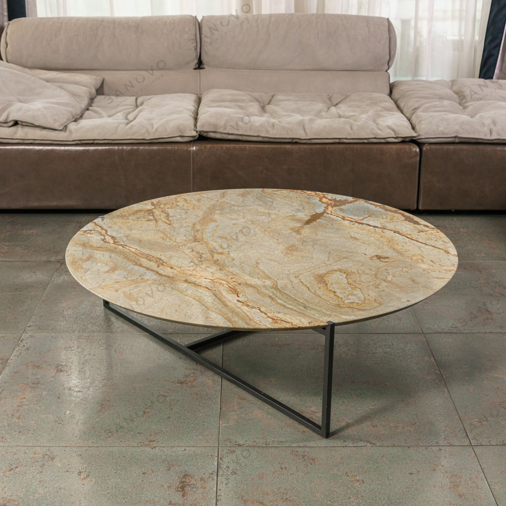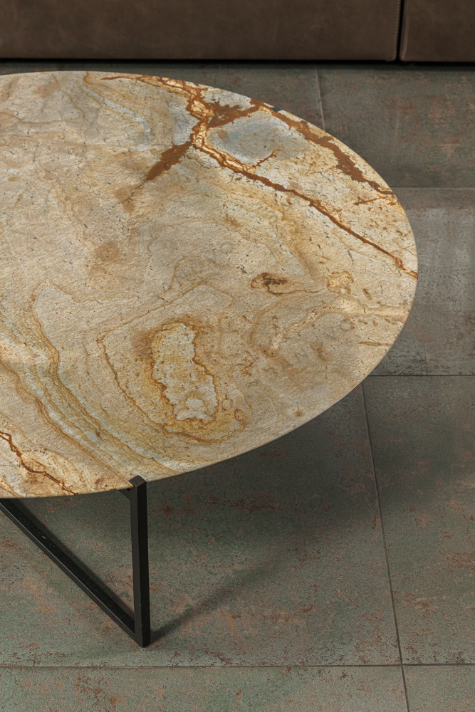 Вашему вниманию представлена модель журнального стола с круглой столешницей в лимитированном исполнении топа: GRANITO BLUESTONE (месторождение Австралия). Легкая шероховатость матовой отделки подчеркивает рисунок камня. Ассиметричные металлические опоры окрашены в черный матовый цвет.