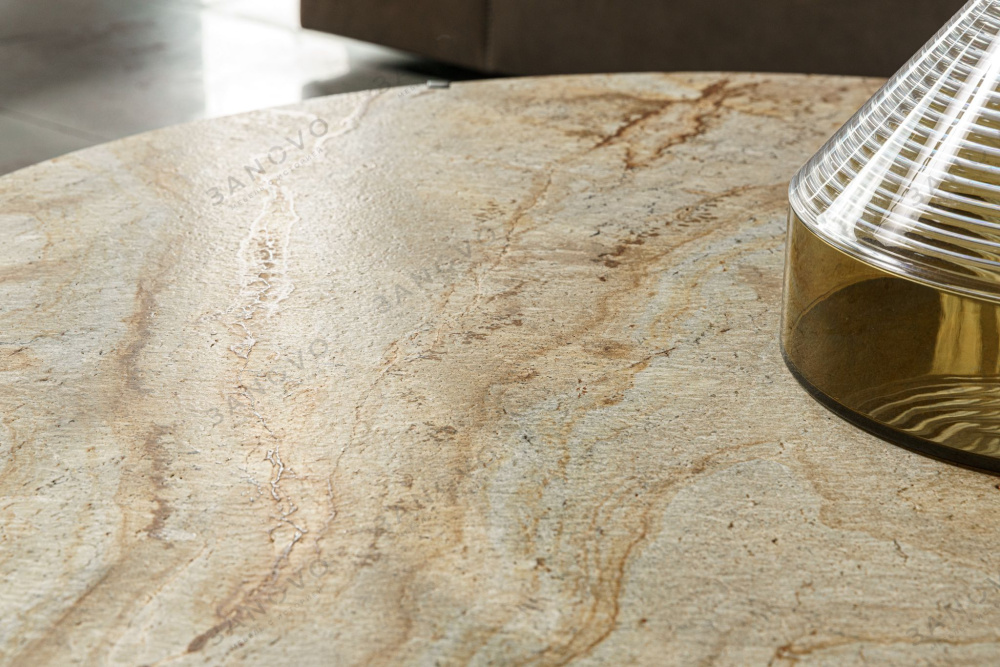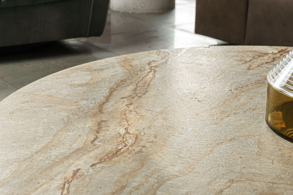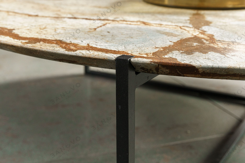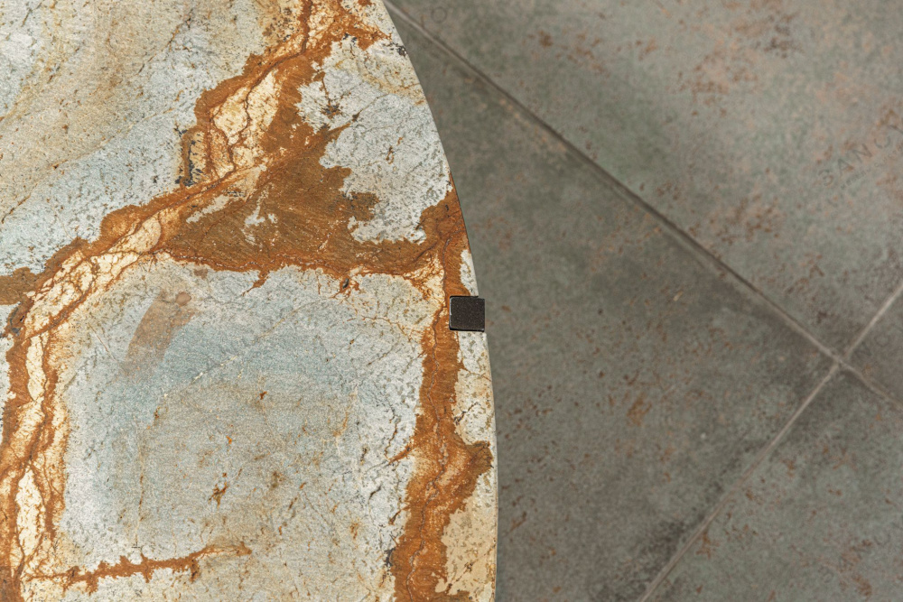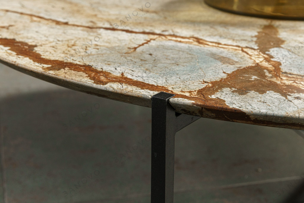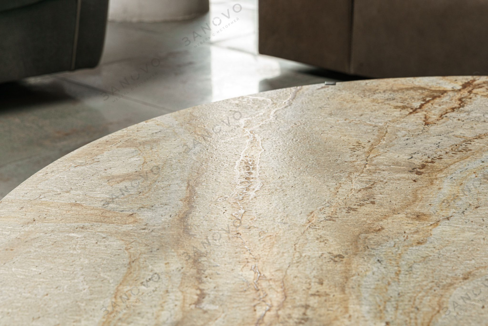 Вашему вниманию представлена модель журнального стола с круглой столешницей в лимитированном исполнении топа: GRANITO BLUESTONE (месторождение Австралия). Легкая шероховатость матовой отделки подчеркивает рисунок камня. Ассиметричные металлические опоры окрашены в черный матовый цвет.
